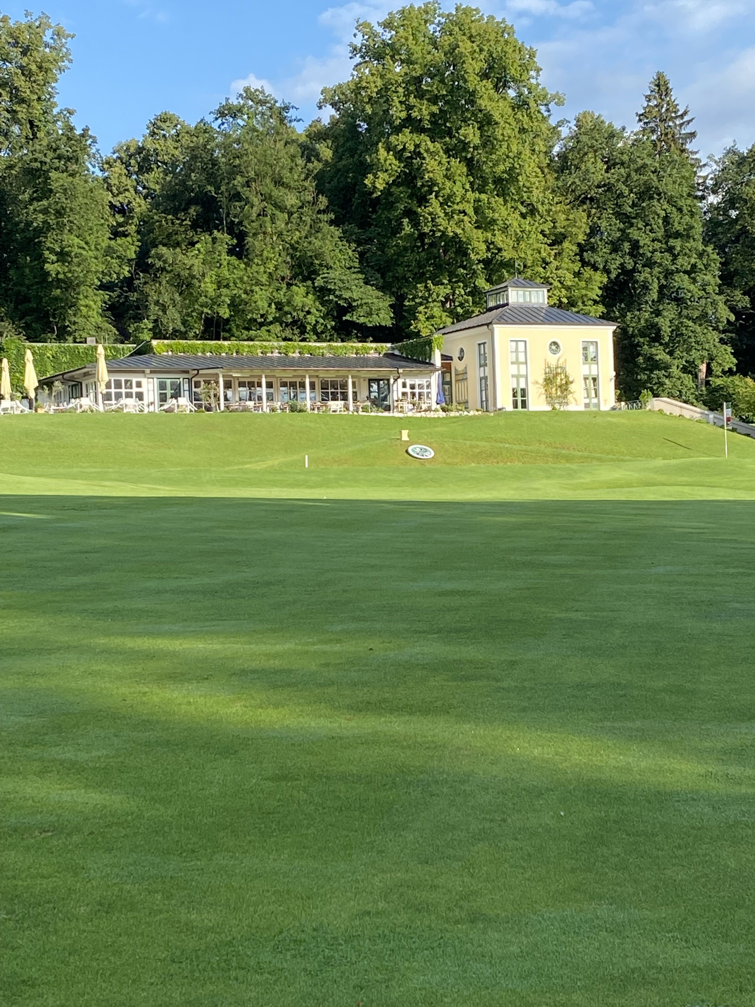 Ein echtes Highlight: Das stilvolle Clubhaus im Orangerie-Look oberhalb der 18. Bahn. Von der Terrasse aus genießt man den Blick auf das letzte Grün und die Voralpen – perfekt für einen Sundowner nach der Runde.